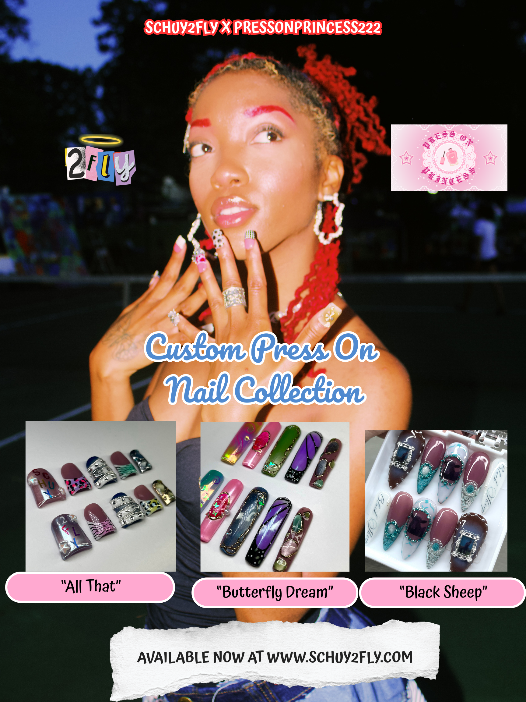 CHECK OUT OUR LATEST MERCH COLLECTION, A ONE-OF-A-KIND COLLABORATION BETWEEN SCHUY2FLY AND AUSTIN, TEXAS NAIL ARTIST, CAYLA CLEBURN, (AKA PRESSONPRINCESS222)